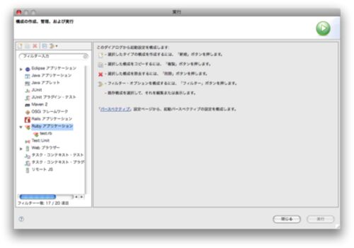 Ruby Plugin の完成度が結構高い 昔 RDT って Plugin 使ってた頃があったけど*1、あれよりも細かい所で使い勝手が良くなってる気がする。 で、それは良いのだけど、実行する時にプログラムの実行と RUnit によるテストケースの実行がメニューにある。 それは…